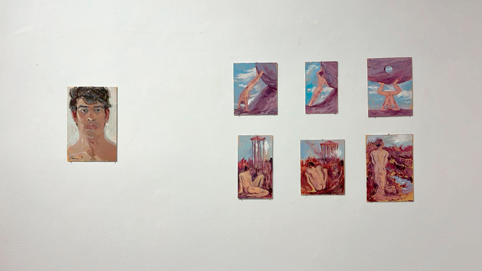 Con inspiración en la historia y filosofía, la cultura clásica, el realismo mágico o la religión cristiana, así como en el presente más contemporáneo, la era digital o la cultura del porno, el joven artista repiensa, a través de la plástica, en el espectro que oscila entre la compañía y la soledad, o más bien, en ese punto exacto donde ambas, se entrelazan.